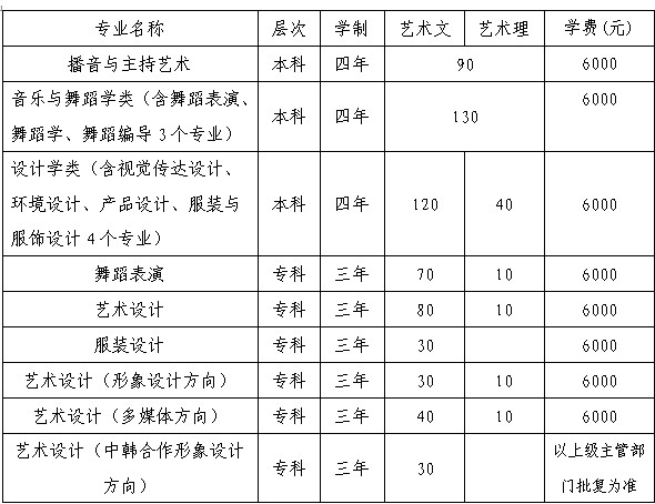 普通?疲何璧副硌荨⑺囆g(shù)設(shè)計(jì)、服裝設(shè)計(jì)、藝術(shù)設(shè)計(jì)(形象設(shè)計(jì)方向)、藝術(shù)設(shè)計(jì)(多媒體方向)、藝術(shù)設(shè)計(jì)(中韓合作形象設(shè)計(jì)方向)。