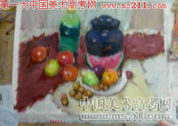 水粉考題:照片寫生,一個(gè)晶黑色瓷罐,一個(gè)淡翠綠色大可樂瓶子,一個(gè)白盤子,兩個(gè)個(gè)橘子,兩個(gè)紅蘋果,兩顆梨,桂圓等若干,切開的西瓜一快,一塊底色是白襯布,還有一塊象牙白襯布,一塊紅色襯布。