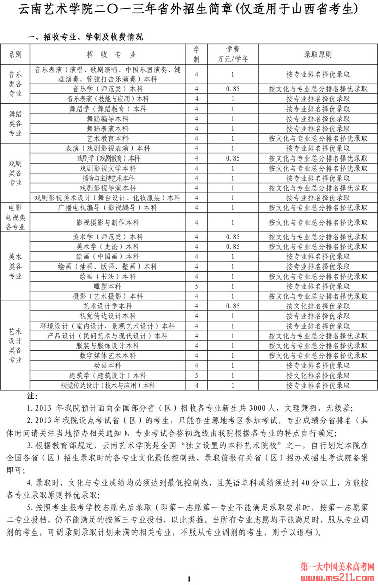 云南藝術(shù)學(xué)院2013年省外錄取原則(山西)
