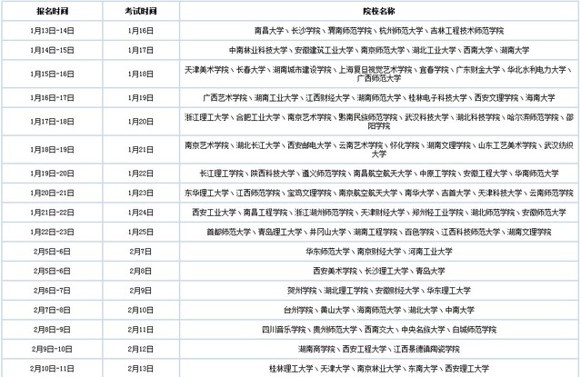 1月15日-16日 1月18日 天津美術(shù)學(xué)院丶長春大學(xué)丶湖南城市建設(shè)學(xué)院丶上海復(fù)旦視覺藝術(shù)學(xué)院丶宜春學(xué)院丶廣東財(cái)金大學(xué)丶華北水利電力大學(xué)丶廣西師范大學(xué)