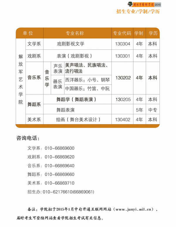 解放軍藝術(shù)學(xué)院創(chuàng)建于1960年,是中國人民解放軍唯一的一所多學(xué)科、綜合性高等藝術(shù)院校。學(xué)院下設(shè)文學(xué)、戲劇、音樂、舞蹈、文化管理、美術(shù)、軍事文化傳播7個系,開辦了研究生、本科、大專、中專學(xué)歷教育和軍隊干部任職教育、士官培訓(xùn)。學(xué)院座落在高校林立、文化藝術(shù)氛圍濃厚、高科技人才密集的北京市海淀區(qū)中關(guān)村。