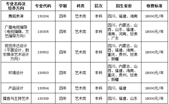 五、藝術類專業(yè)招生省份安排及收費標準注:以上招生專業(yè)(專業(yè)方向)、招生省份及招生計劃以各。ㄗ灾螀^(qū)、直轄市)招生行政主管部門統(tǒng)一公布為準。