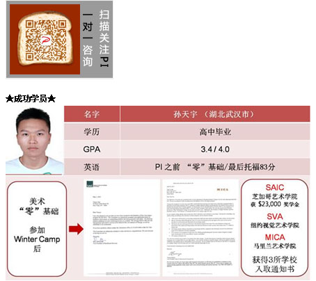 PI Art Center為有志于考取美國(guó)藝術(shù)大學(xué)的藝術(shù)生在夏季和冬季開展短期的特別項(xiàng)目Special Program,讓參加的學(xué)員在短短6周時(shí)間內(nèi)、由世界頂級(jí)藝術(shù)院校現(xiàn)任教授授課、完成學(xué)生自己獨(dú)一無(wú)二的藝術(shù)作品集!提前體驗(yàn)原汁原味的美國(guó)大學(xué)授課和教學(xué)模式!保障學(xué)員在2016年美國(guó)藝術(shù)大學(xué)春、秋季入學(xué)!