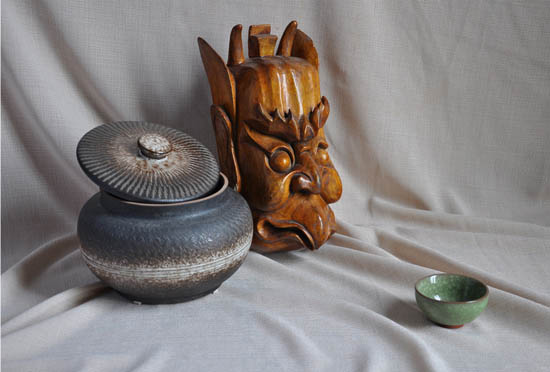 三、模擬寫生內(nèi)容:一個(gè)木制儺面具,一個(gè)帶蓋的陶罐,一個(gè)小陶瓷茶杯,一塊淺色襯布。(見圖片小樣)
