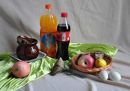 三、模擬寫生內(nèi)容:一瓶橙汁,一瓶可樂,一個(gè)帶蓋的陶罐,一個(gè)瓷盤,一個(gè)柳編盤,兩個(gè)蘋果,三個(gè)粽子,一個(gè)檸檬,兩個(gè)鴨蛋,一塊綠色襯布、一塊淺色襯布。(見圖片小樣)