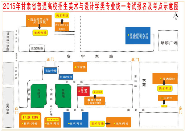 請(qǐng)各位考生報(bào)名后,提前了解考場(chǎng)地點(diǎn)。知行學(xué)院考點(diǎn)考生請(qǐng)乘車至水掛莊橋下車,北行約400米即到。西北師范大學(xué)新校區(qū)考點(diǎn)考生請(qǐng)乘車至鋁廠家屬區(qū)下車,北行約400米即到。考務(wù)組在報(bào)名點(diǎn)設(shè)有各考點(diǎn)教學(xué)樓分布方位示意簡(jiǎn)圖,請(qǐng)認(rèn)真查看(參見下圖)。