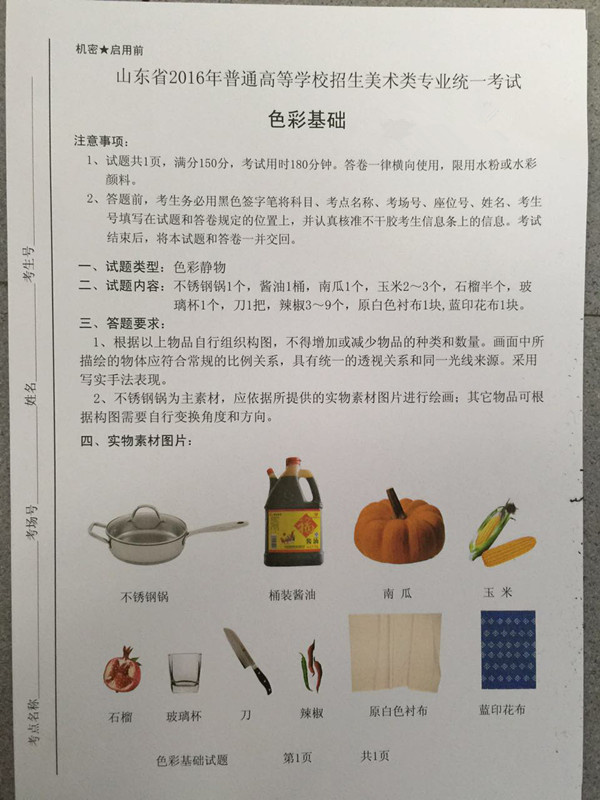 2016年山東美術(shù)聯(lián)考2015年12月20日進(jìn)行,8∶30—11∶30造型基礎(chǔ)考試,14∶00—17∶00色彩基礎(chǔ)考試。造型基礎(chǔ)(素描)和色彩基礎(chǔ)的考試用時(shí)均為180分鐘,單科滿分為150分,兩科總分為300分。造型基礎(chǔ)(素描)和色彩基礎(chǔ)的考試范圍均為靜物,考試形式以文字命題結(jié)合圖形素材的方式。