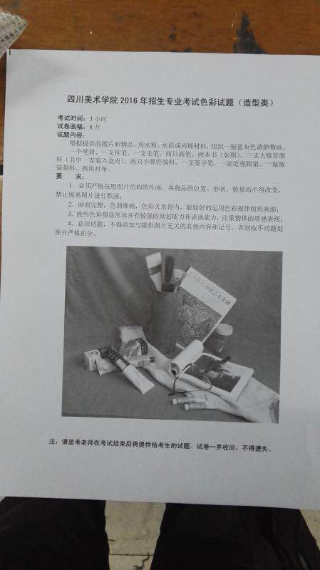 色彩考題:(規(guī)定藍(lán)灰色調(diào))一個筆筒,里面一支平頭刷子,一支毛筆,兩支扇形筆。兩本書,三支大的管裝顏料(其中一個在盒子里),兩支小的管裝顏料,一個盒裝顏料,一個眼鏡,一支筆四川美術(shù)學(xué)院