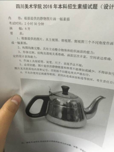 素描考題:(設(shè)計類)根據(jù)水壺,從主視圖、俯視圖、側(cè)視圖三個不同角度做題完成一幅素描。