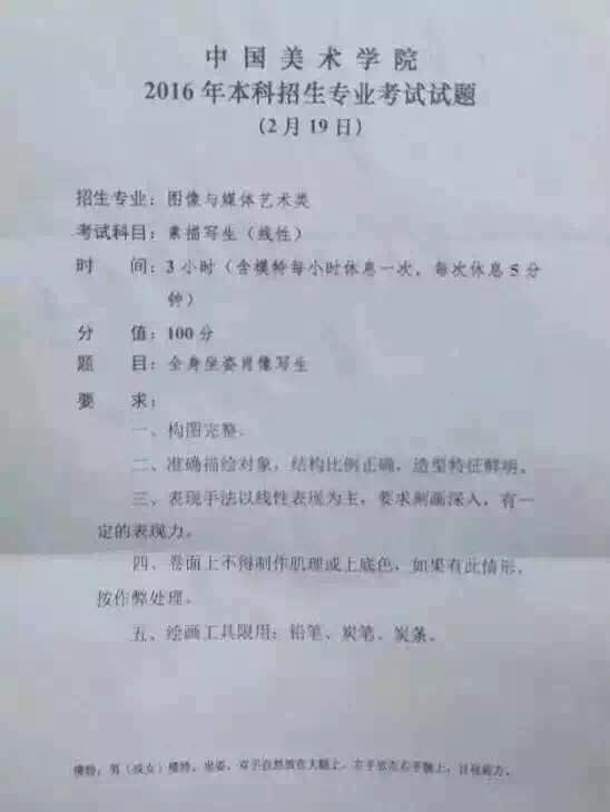 中國美術學院2016年本科招生專業(yè)?伎荚囶}目 考點信息:全國考點 專業(yè):圖像與媒體藝術類 速寫考題:考生互畫三人場景 素描考題: