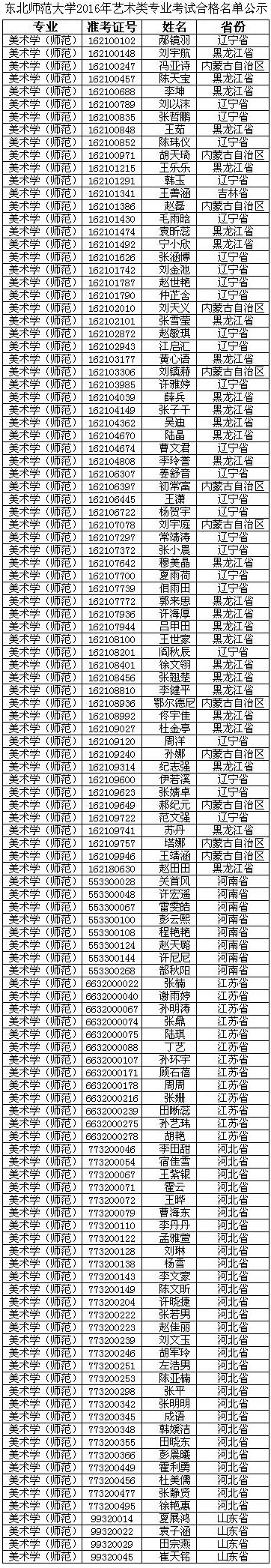 經(jīng)學(xué)校招生領(lǐng)導(dǎo)小組審核,東北師范大學(xué)2016年美術(shù)學(xué)(師范)專業(yè)?己细衩麊芜M(jìn)行公示。如有異議,請(qǐng)考生于5月20日前實(shí)名向我校申述。