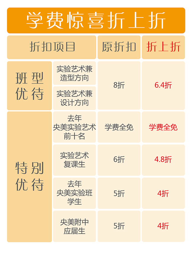 凡參與體驗(yàn)課活動(dòng)的學(xué)員,如決定報(bào)名央美實(shí)驗(yàn)班,可享受原有折扣基礎(chǔ)上再打8折的年度終極優(yōu)惠!超低折扣全學(xué)年僅此一波。