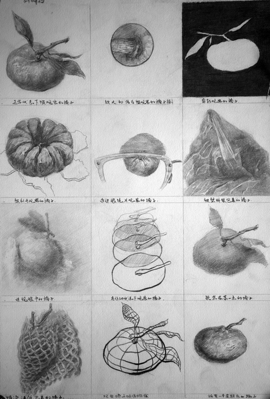 ①在4開素描紙上經(jīng)營位置,將12種桔子的造型適當(dāng)?shù)陌才旁谏厦妫?br />