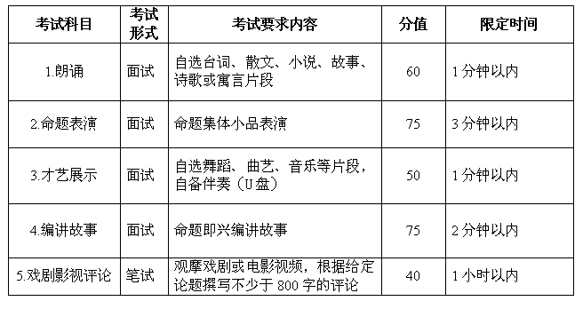 面試,通過(guò)抽題確定題目進(jìn)行小品表演,人數(shù)限定五人,考察考生是否具備根據(jù)生活感受提煉、加工成舞臺(tái)人物形象的創(chuàng)造力,對(duì)規(guī)定情境、事件、人物和人物關(guān)系的理解力,以及考生的舞臺(tái)信念感、想象力、激情和即興的交流與適應(yīng)能力。