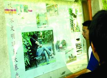 昨天中午,北方工業(yè)大學(xué)學(xué)生食堂前的櫥窗周圍圍滿了吃完午飯的學(xué)生。在總共12塊櫥窗內(nèi),活動策劃者采用了大量的圖片和漫畫展示校園內(nèi)不文明現(xiàn)象:教室課桌和墻壁被涂鴉得一塌糊涂、圖書館內(nèi)的書籍損毀嚴(yán)重、教室和寢室一片狼籍、學(xué)校機房成了游戲廳、上課時的各種小動作以及情侶們在校內(nèi)親熱舉動……面對著這些熟悉的場面,學(xué)生們議論紛紛,有的還在小聲議論圖片上的地點。
