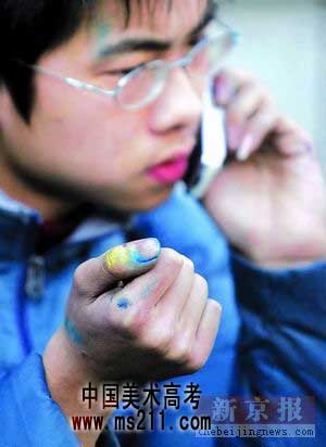 走出考場(chǎng)的考生在緊張地通報(bào)考試情況,手上和額頭的顏料尚未擦去