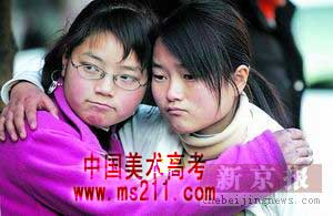 考試結(jié)束了,兩個(gè)女生相擁在考場(chǎng)外,滿是凍瘡的手和黯然的表情訴說(shuō)著艱辛