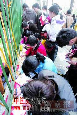 “藝術(shù)專業(yè)聯(lián)考”報(bào)名處異常火爆,蜂擁而來(lái)的家長(zhǎng)和學(xué)生趴在鐵欄桿外填寫表格