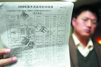 記者從陳女士手中看到,她所持的時(shí)間表明顯是翻印的,印刷質(zhì)量很差,許多地方模糊不清。記者昨日在現(xiàn)場(chǎng)還碰到了陪朋友考試的另外一位考生小林,小林說自己是比較幸運(yùn)的,因?yàn)樗凑召I的時(shí)間簡(jiǎn)表準(zhǔn)備于17日參加?xùn)|華大學(xué)的招生考試時(shí),才發(fā)現(xiàn)考試時(shí)間是18日。而每年有1000多人報(bào)名的貴州師范大學(xué)這次報(bào)名人數(shù)卻僅僅只有400余名,“罪魁禍?zhǔn)住币彩沁@個(gè)考生幾乎人手一份的時(shí)間表。貴州師范大學(xué)美術(shù)學(xué)院副院長(zhǎng)顧靜教授告訴記者,翻印的時(shí)間表里把貴州師范大學(xué)印刷成了貴州師范學(xué)院,并且還把本來屬于B類大學(xué)的貴州師范大學(xué)降到了C類大學(xué)。許多考生因?yàn)閷?duì)學(xué)校名字不熟悉再加上考慮到是C類院校而直接忽略過去,考生也不能在表中找到貴州師范大學(xué)的報(bào)考時(shí)間和考試內(nèi)容,導(dǎo)致報(bào)考該校的人數(shù)劇減。