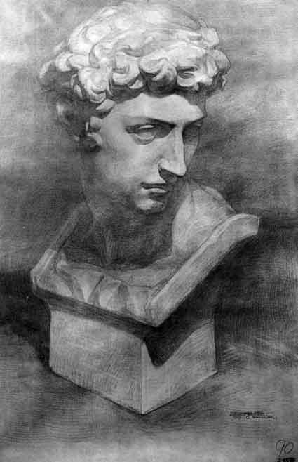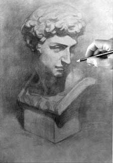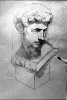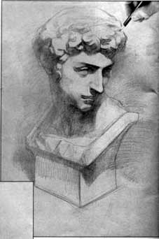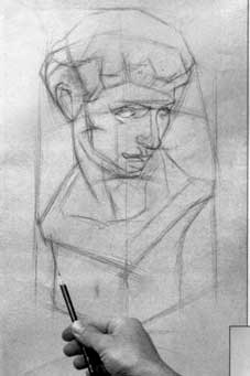 以形體結(jié)構(gòu)的相互組合來認(rèn)識(shí)所畫的石膏形象,畫準(zhǔn)形體的透視關(guān)系,處理好頭、頸、胸等的大的關(guān)系。