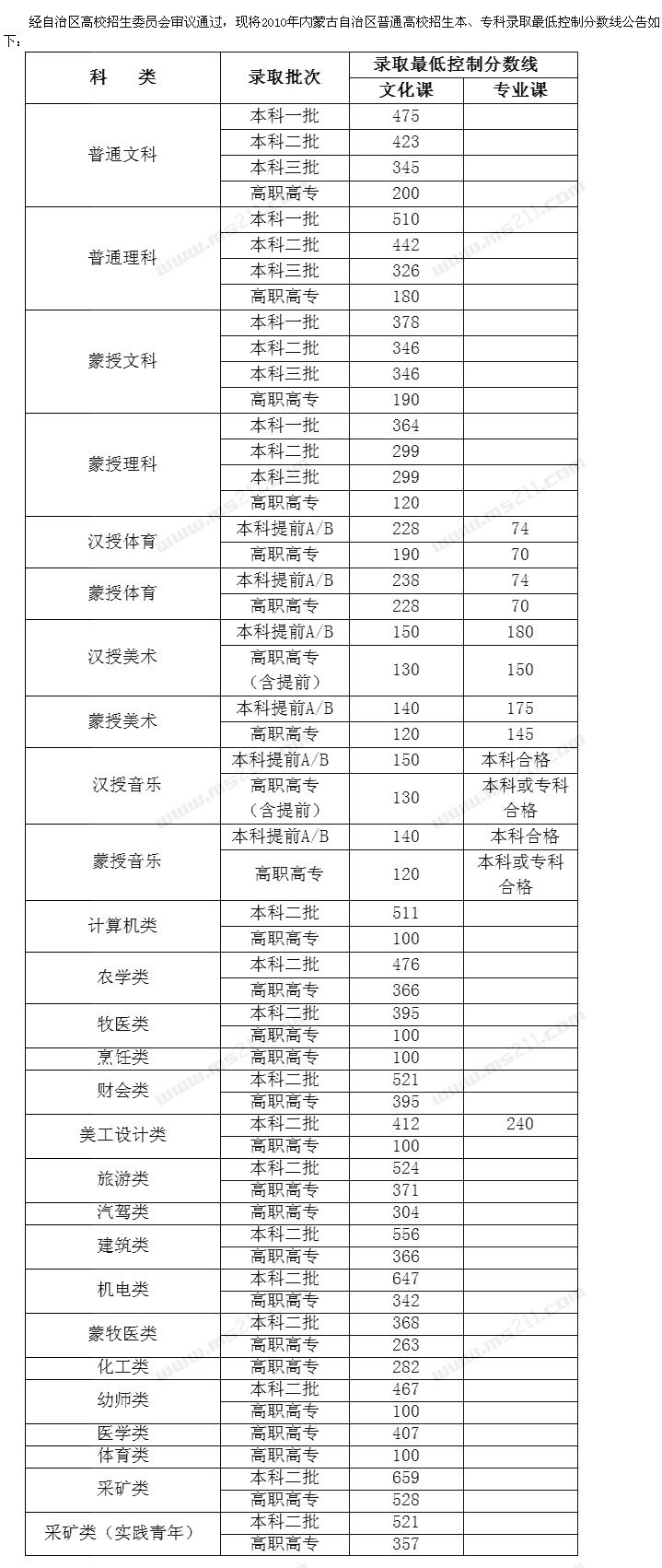 2010年內(nèi)蒙古高考錄取分數(shù)線(含美術)