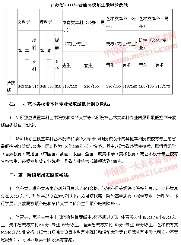 2011年江蘇省普通高等學(xué)校招生錄取控制分數(shù)線