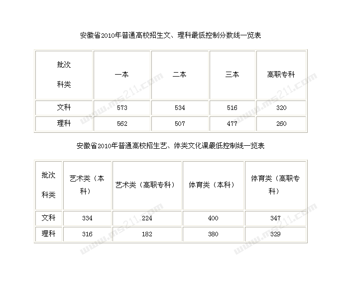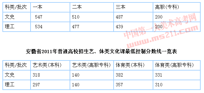 安徽省2012年普通高校招生文史、理工類最低控制分數線一覽表