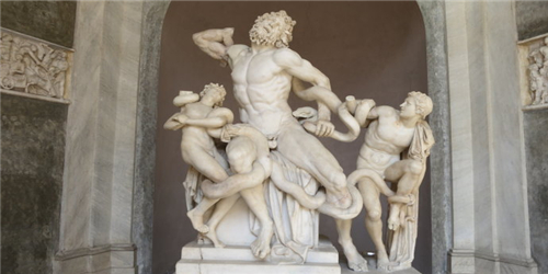 這組群雕被發(fā)現(xiàn)的時候,拉奧孔的右臂已經(jīng)遺失,并且兩個孩子當(dāng)中一個遺失了手掌,另一個遺失了右臂。但如今都被補全。雕像中,拉奧孔位于中間,神情處于極度的恐怖和痛苦之中,正在極力想使自己和他的孩子從兩條蛇的纏繞中掙脫出來。他抓住了一條蛇,但同時臀部被咬住了;他左側(cè)的長子似乎還沒有受傷,但被驚呆了,正在奮力想把腿從蛇的纏繞中掙脫出來;父親右側(cè)的次子已被蛇緊緊纏住,絕望地高高舉起他的右臂。那是三個由于苦痛而扭曲的身體,所有的肌肉運動都已達到了極限,甚至到了痙攣的地步,表達出在痛苦和反抗?fàn)顟B(tài)下的力量和極度的緊張,讓人感覺到似乎痛苦流經(jīng)了所有的肌肉、神經(jīng)和血管,緊張而慘烈的氣氛彌漫著整個作品。