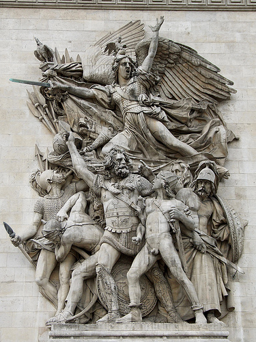 《馬賽曲》不僅是法國人民抵抗奧國侵略的紀(jì)念碑,也是表現(xiàn)人民革命精神和熱情的不朽之作。它在細節(jié)處理和整體構(gòu)圖的關(guān)系上十分諧調(diào),富于運動感并有統(tǒng)一的氣勢。人物造型是真實的,形象構(gòu)思卻是寓意和象征的。無論從造型上,還是從人物情緒的表現(xiàn)上看,都大大強于凱旋門上的其它三幅浮雕(左側(cè)為古典派雕刻家柯爾托 [1787 — 1843] 所作的《拿破侖加冕》;背面兩塊也改為了青年雕刻家埃特克斯 [1808 — 1888] 的作品)。