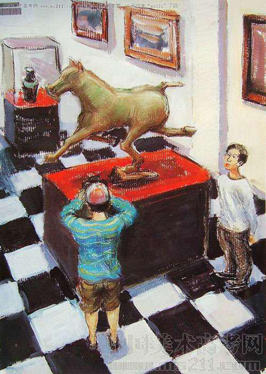 例舉漢代《馬踏飛燕》就是這類作品里的典范,如果學(xué)生能利用博物館觀看此作品為畫面,亦可以完成一張《穿越》的創(chuàng)作。因?yàn)樯锨晡奈锪鱾鞯浆F(xiàn)在即為一種“穿越”,何況《馬踏飛燕》本來就表達(dá)了飛速的奔跑概念。當(dāng)年美院創(chuàng)作高分卷《奔跑》一題中的這個(gè)畫面也可以完成“穿越”這樣一個(gè)主題。