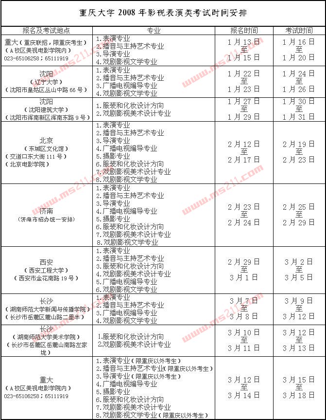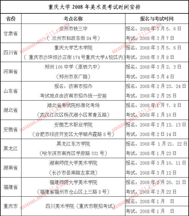 考點設在:北京(東城區(qū)文化館)(北京電影學院)、遼寧沈陽(遼寧大學)(沈陽建筑大學)、山東濟南(濟南市招辦統(tǒng)一安排地點)、陜西西安(西安工程大學)、湖南長沙(湖南師范大學新聞與傳播學院、湖南師范大學美術學院)以及重慶大學本部。具體考試時間和考試內(nèi)容見附表。