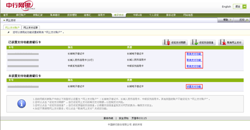 本頁(yè)顯示網(wǎng)上支付銀行卡信息(圖9),包括已設(shè)置支付功能和未設(shè)置支付功能的銀行卡,還可對(duì)其進(jìn)行相應(yīng)的取消或開(kāi)通支付功能操作。