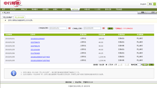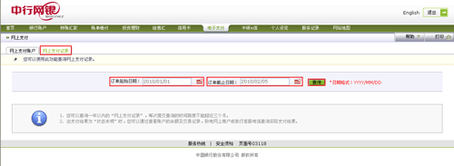 在“電子支付”下,點(diǎn)擊“網(wǎng)上支付”>“網(wǎng)上支付記錄”,可根據(jù)您輸入的起始及結(jié)束日期進(jìn)行網(wǎng)上支付記錄查詢(圖14),可查詢一年以內(nèi)的“網(wǎng)上支付記錄”,每次提交查詢的時(shí)間跨度不能超過(guò)三個(gè)月。