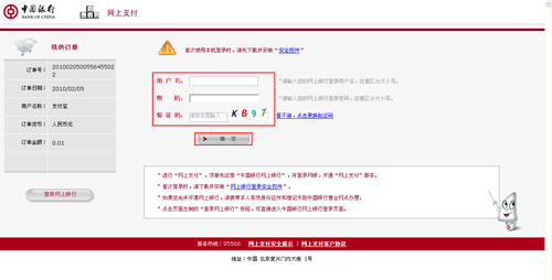 您在網(wǎng)上選定商品,選擇中行網(wǎng)上支付后,會(huì)彈出中行網(wǎng)上支付頁(yè)面,請(qǐng)輸入用戶名、密碼及驗(yàn)證碼,點(diǎn)擊“確定”進(jìn)入下一步(圖10)。