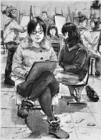 場景速寫是各類速寫的集成,它包括了人物速寫、動物速寫、動態(tài)速寫、道具速寫、風(fēng)景速寫等諸多速寫的表現(xiàn)形式。場景速寫的表現(xiàn)方法也囊括了所有速寫的表現(xiàn)技術(shù)。場景速寫的作畫步驟更加自由,內(nèi)容可以無限制地添加,道具可以任意挪動,背景可以根據(jù)需要變換。場景速寫需要更強的整體控制能力和局 部刻畫能力,需要更高的組織安排能力和對美感形式的把握。