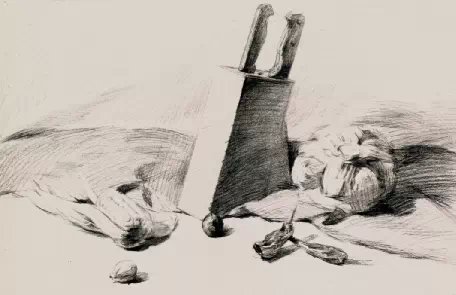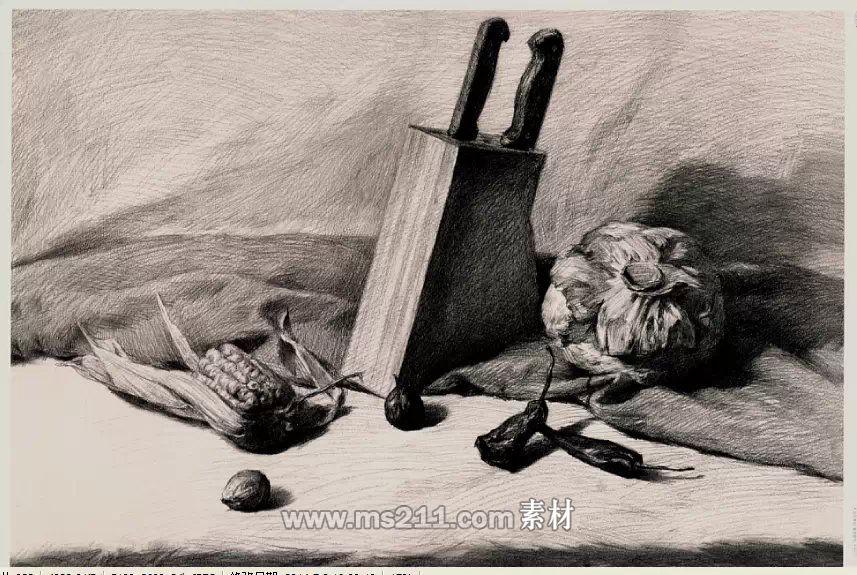 蔬菜有很多是形狀復(fù)雜的,例如卷心菜、大白菜、油菜、菠菜等,這樣的物體要注意其整體關(guān)系,刻畫(huà)的時(shí)候不能被它的局部牽引,表現(xiàn)的時(shí)候注意物體的明暗要隨著它的形體走。還有類(lèi)似于青椒、尖椒、茄子、番茄之類(lèi)的表面光滑的物體,表現(xiàn)的時(shí)候物體的質(zhì)感物體的高光是比較重要的。