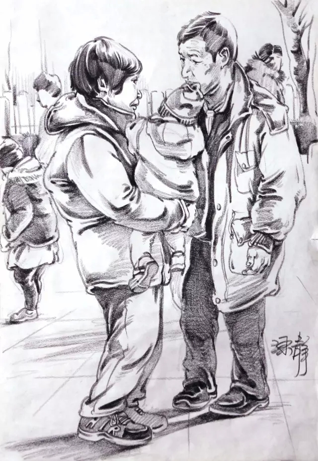 場景速寫中所指的動態(tài)是畫面中單個或組合人物的動作形態(tài)。由于場景速寫主要對象是活動著的眾多人物,眾人的動作隨時發(fā)生著不同的變化,如何在畫面中安排好人的動作變化是場景速寫中的一個重要問題。注意眾多人物之間的形體和他們各自之間形體的穿插和他們的動態(tài)特征,要用心去比較對比,突出重點人物,后面被阻擋的人物面積占的比例小,在構圖完成后,一般要在最好畫,在主體人物畫完之后,可以作為參照畫后方的人物,要注意他們的關系。