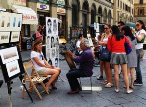 意大利的街頭多是眾多的街頭藝術家,自彈自唱,現(xiàn)場作畫,五花八門,各展所長。有些是創(chuàng)意取勝,在名勝古跡的門口裝扮成各式古裝人物與游客合影,服裝配飾很是下了一番功夫。這些來自五湖四海的街頭藝術家,他們沒有固定的工作或沒有正常的居所,但他們憑著對藝術的熱愛執(zhí)著,靠自己的本事養(yǎng)活自己,值得人敬佩。藝術,不只存在于華麗的博物館中,不光局限于漂亮的音樂廳里,它們更存在于街頭巷尾的每一個角落。在這里,藝術不分貴賤,驚喜隨處可見。