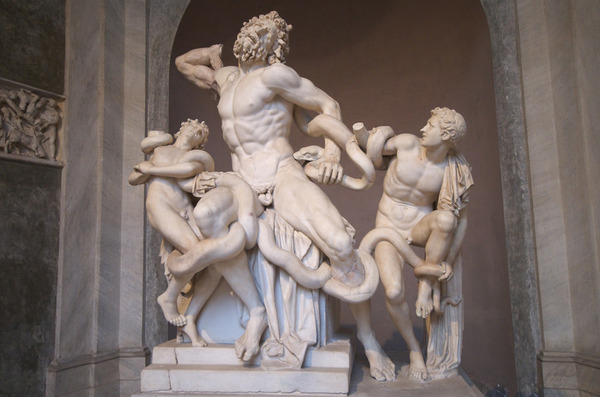 另一個(gè)非常著名的展品就是《拉奧孔群雕》。拉奧孔是特洛伊的祭司,當(dāng)時(shí)希臘軍隊(duì)久攻不下特洛伊,就假意撤軍留下了巨型的木馬。拉奧孔警告他的同胞們“不要相信這木馬,即使希臘人帶著禮物來,我也怕他們。”(這句名言后來演變成一句諺語,就像是我們的俗語-黃鼠狼給雞拜年。)但是狂妄的特洛伊人沒有聽從拉奧孔的勸告,將藏有希臘士兵的木馬拉進(jìn)了城。支持希臘的雅典娜,派出巨蟒殺死了拉奧孔和他的兩個(gè)兒子,這組群雕表現(xiàn)的就是巨蟒纏死拉奧孔父子的情景。