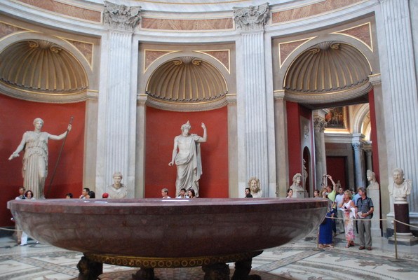 接下來讓我們來看一下圓形的展廳,它是庇護(hù)克萊門蒂諾博物館的一部分,名字就叫圓形展廳。展廳正中擺放著一個(gè)直徑4.76米的大圓盆,據(jù)說是尼祿皇帝的浴盆。它是由一整塊紫色云石制成,非常奢侈華麗。
