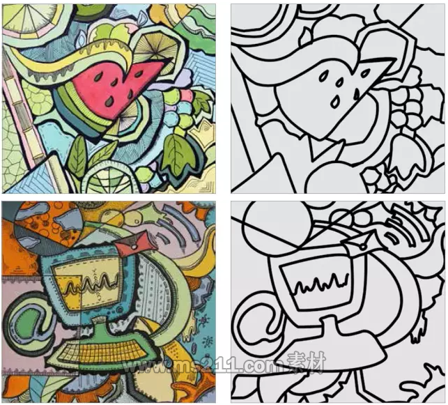我們常用的表現(xiàn)手法一般分為以下十種:重構(gòu)勾邊、肌理裝飾、質(zhì)感表達、冷暖對比、同類色對比、色相對比、近似色對比、互補色對比、畫面分割、畫面的趣味性和故事性以及質(zhì)感表達。