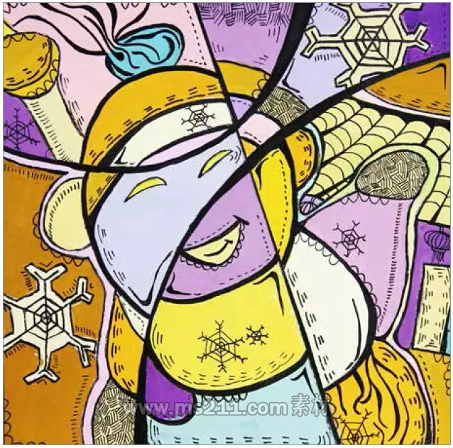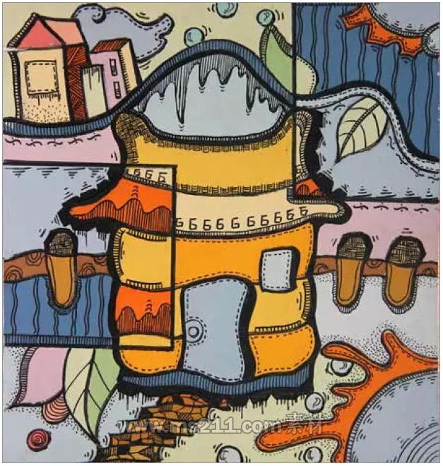 將畫面分割為幾個部分,使物體產(chǎn)生錯位的感覺,也是彩色裝飾畫常用的技法。這是一種把物體打散重組的方法,這是解構(gòu)意識的體現(xiàn)。