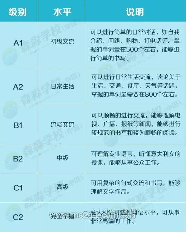 接下來,讓我們來了解,按照歐盟規(guī)定的標(biāo)準(zhǔn),意大利語水平級別劃分如下圖所示: