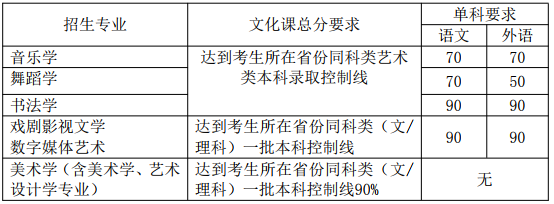 5. 各專業(yè)加設(shè)文化課單科(按滿分150 分計(jì))和文化課成績(jī)總分(不含政策性加分,下同)錄取控制分?jǐn)?shù)線,具體要求如下: