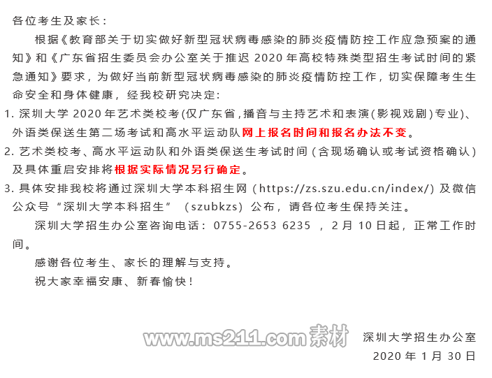關(guān)于推遲深圳大學(xué)2020年藝術(shù)類、外語類保送生及高水平運動隊招生校考工作的通知