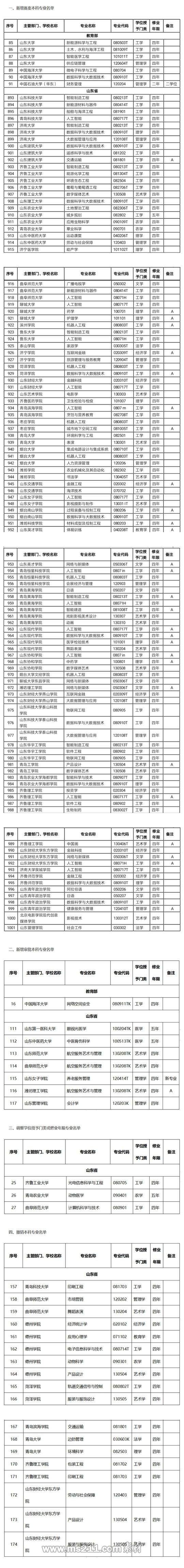 據(jù)統(tǒng)計(jì),此次新增本科專業(yè)名單中,三所駐魯部屬高校——山東大學(xué)、中國海洋大學(xué)和中國石油大學(xué)(華東),新增7個(gè)備案專業(yè)、1個(gè)審批專業(yè);山東省屬高校中,49所高校新增備案本科專業(yè)109個(gè);7所高校各新增審批本科專業(yè)1個(gè);8所高校撤銷本科專業(yè)18個(gè)。此外,3所省屬高校調(diào)整學(xué)位授予門類或修業(yè)年限本科專業(yè)3個(gè)。