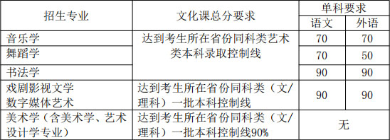 5.各專(zhuān)業(yè)加設(shè)文化課單科(按滿(mǎn)分150分計(jì))和文化課成績(jī)總分(不含政策性加分,下同)錄取控制分?jǐn)?shù)線,具體要求如下: