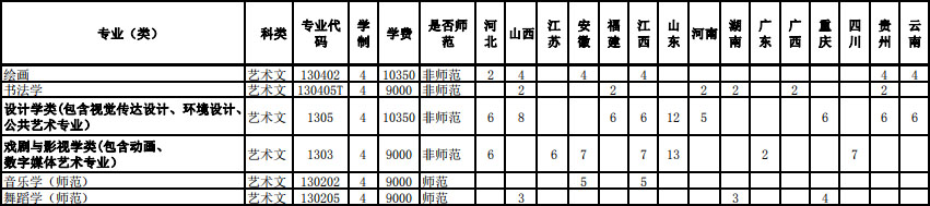 其余省份:對文化、專業(yè)省統(tǒng)考成績均上線的進(jìn)檔考生,采用專業(yè)志愿優(yōu)先、按綜合分從高到低的原則擇優(yōu)錄取。音樂學(xué)(師范)、舞蹈學(xué)(師范)專業(yè)綜合分計(jì)算公式:綜合分=文化成績×40% + [(專業(yè)省統(tǒng)考成績(折合成100分制))×(各省高考文化總分值÷100)×60%]。視覺傳達(dá)設(shè)計(jì)、環(huán)境設(shè)計(jì)、公共藝術(shù)、繪畫、動畫、數(shù)字媒體藝術(shù)專業(yè)綜合分計(jì)算公式:綜合分=文化成績×50% + [(專業(yè)省統(tǒng)考成績(折合成100分制))×(各省高考文化總分值÷100)×50%]。