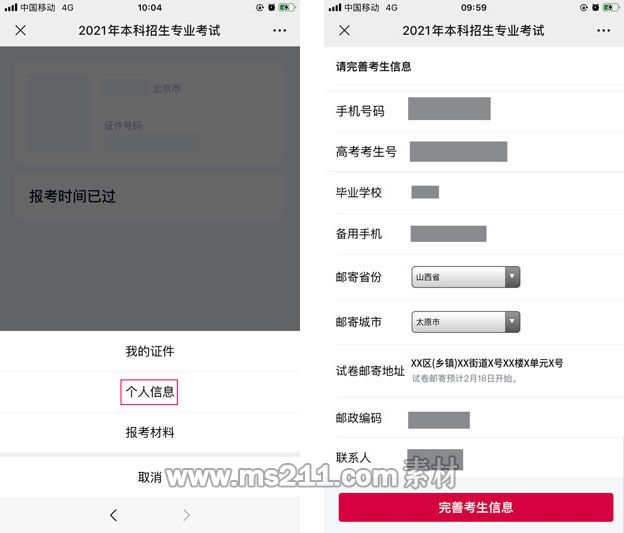 我校2021年本科招生專業(yè)考試報(bào)名已結(jié)束,部分考生試卷郵寄地址填寫不準(zhǔn)確,為保證考試順利,請(qǐng)各位考生務(wù)必于2021年1月12日晚10點(diǎn)前,通過我校“央美招生”微信公眾號(hào)進(jìn)入招生系統(tǒng),在“我的--個(gè)人信息”中查看試卷郵寄地址等信息,信息不詳?shù)目忌?qǐng)務(wù)必重新填寫,如因地址不詳導(dǎo)致試卷郵寄失敗影響考試,后果由考生自行承擔(dān)。