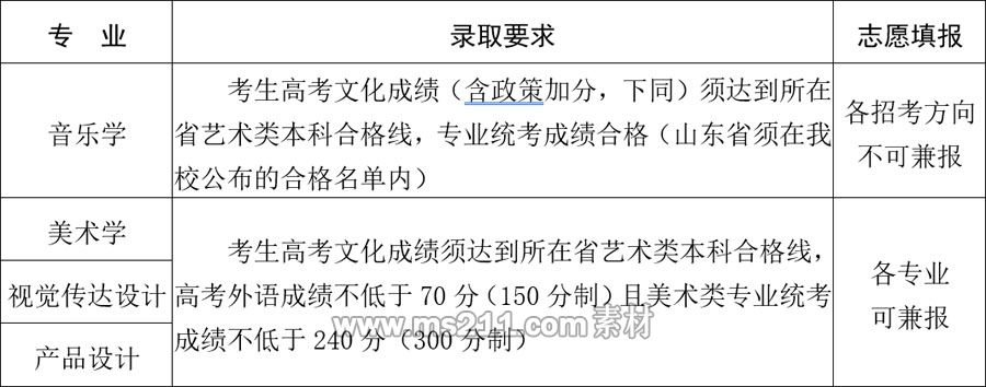 2021年起,我校藝術類各專業(yè)全部使用各省統(tǒng)考成績錄?。ㄉ綎|省音樂學專業(yè)為我校重新計算的專業(yè)成績,方法見“報考條件”),不再單獨組織專業(yè)???。